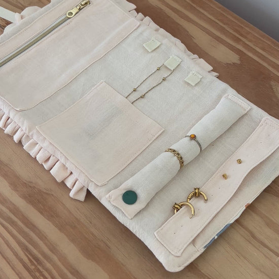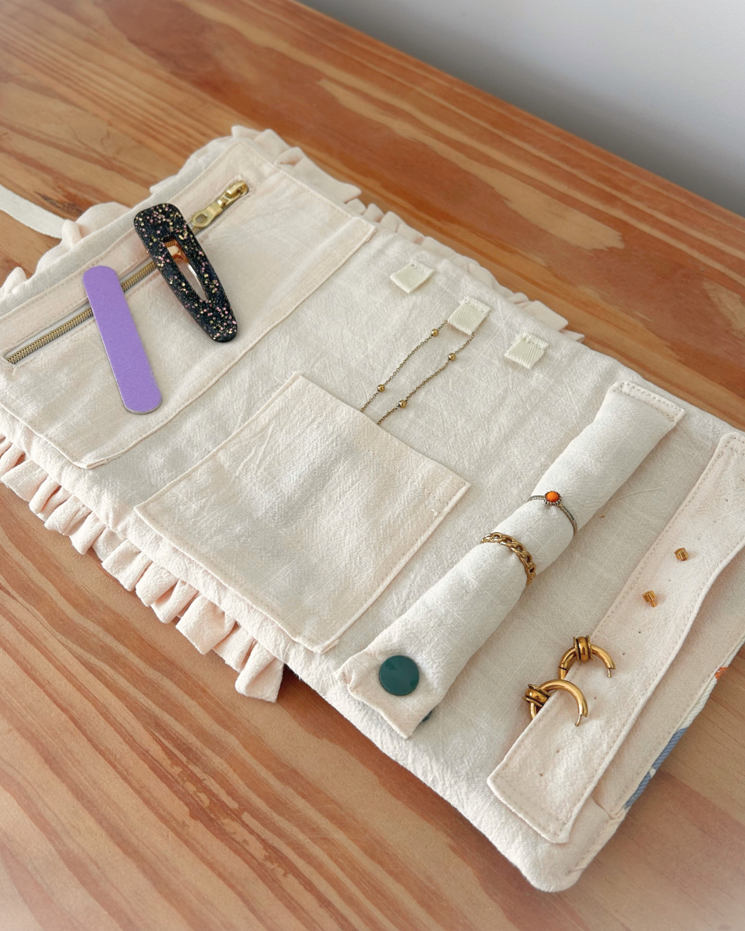 Une jolie trousse pensée pour garder vos bijoux bien organisés, même en déplacement ! Cousue à la main dans mon atelier, elle se plie trois fois sur elle-même pour devenir compacte et facile à glisser dans un sac ou une valise. ✨